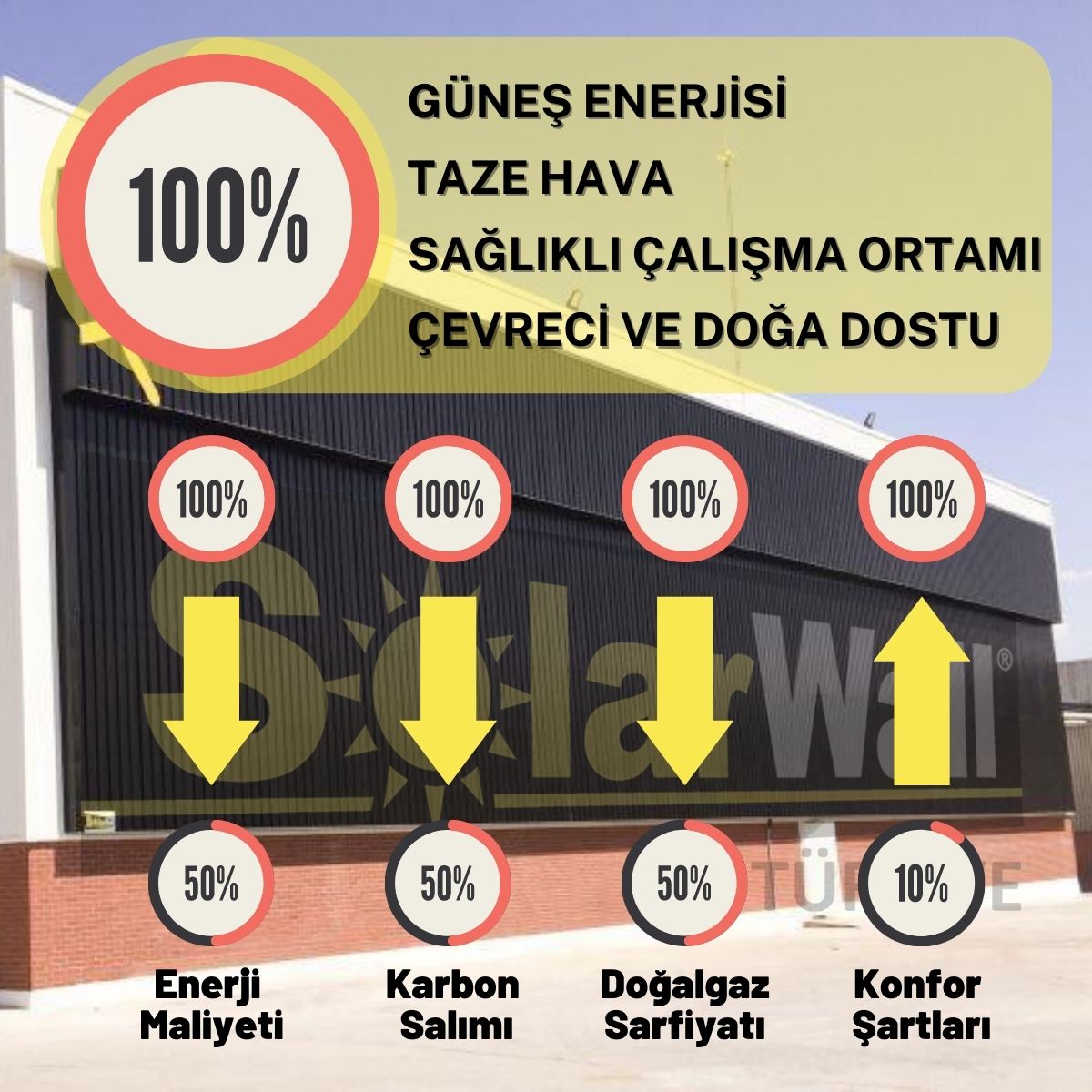 Güneşten hava ısıtmanın global markası SolarWall, Güneşten aldığı enerjisini yeni nesil inovatif teknolojisi ile küresel varlığı yerel uzmanlığını da katarak yeşil dönüşümde %100 fayda, işletme maliyetlerinde %50 kârlılık sağlayarak sürdürülebilirliğe, rekabetçiliğe ve karbon ekonomisine geçişte 50 yıl ömürlü öncü teknoloji olarak değer üretmeye devam ediyor.