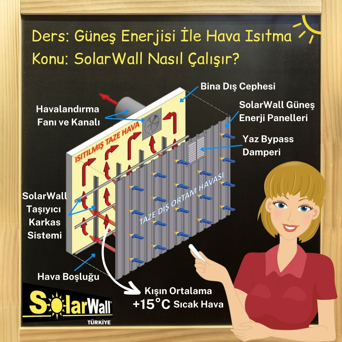 1. SolarWall, Güneş enerjisinden en fazla yararlanacağı; binaların güney, güney doğu veya güney batı cephelerine, cephe ile paneller arasında 20-30 cm boşluk kalacak şekilde tasarlanır ve uygulanır.